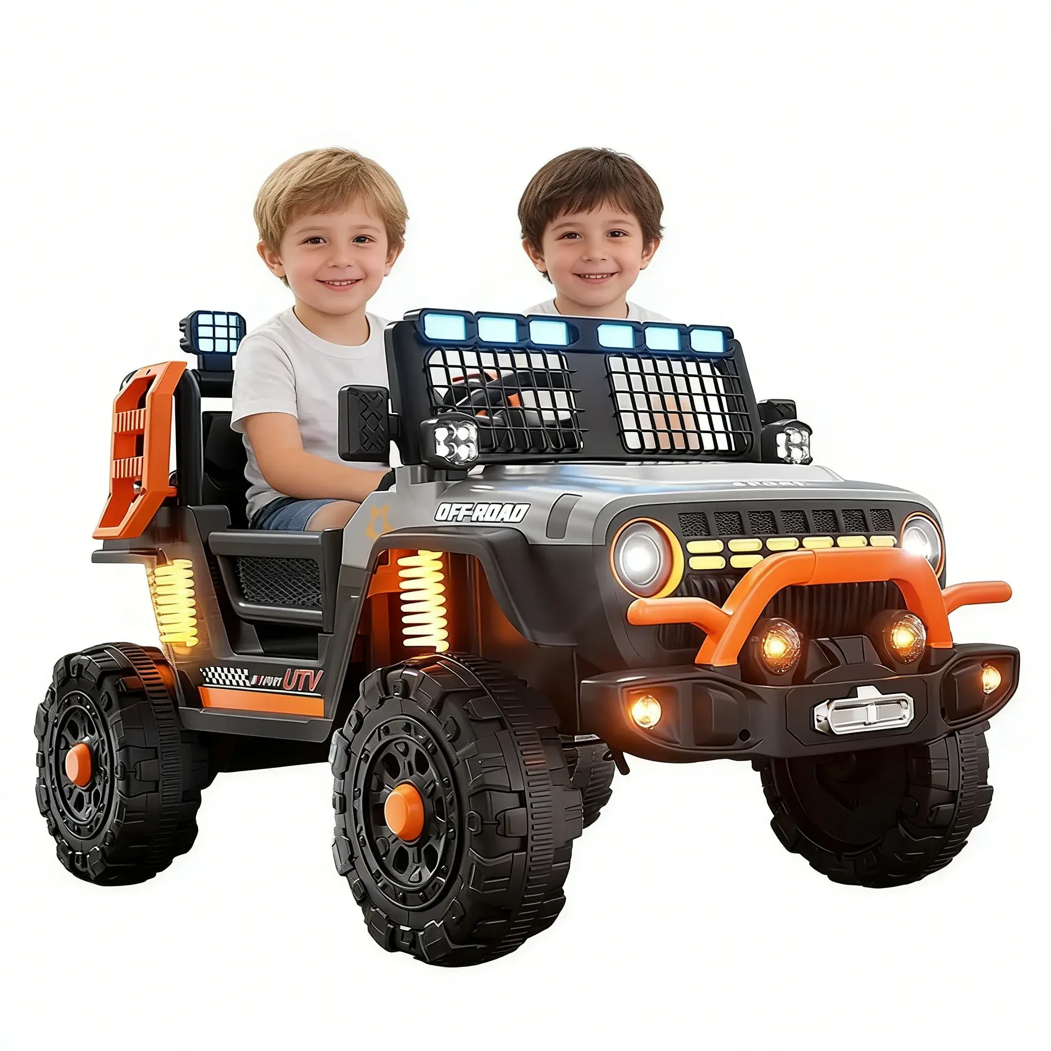 “Best kids’ toy we’ve bought! The unique orange-gray and purple color combo stands out, and the build feels super sturdy (12kg but easy to move). Extra-wide seat is comfy for my son and me to ride together—great parent-child time. Bluetooth/USB music works flawlessly, and the gentle start prevents jolts. Off-road tires grip well on bumpy paths, and the safety doors add a fun, secure touch. Meets all safety standards, and the simulated steering wheel with lights makes him feel like a real driver. Highly recommend for adventure-loving kids!”